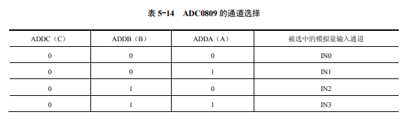 1)地址引脚ADDC、ADDB和ADDA,用于模拟输入通道的选择,见表5-14。