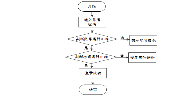 用户输入账号和密码后,系统首先判断账号是否正确,若不正确则提示“账号错误”;如果账号正确,则继续判断密码是否正确,若密码错误则提示“密码错误”;若账号和密码均正确,则显示“登录成功”,最后结束流程。如图3-5-2所示。