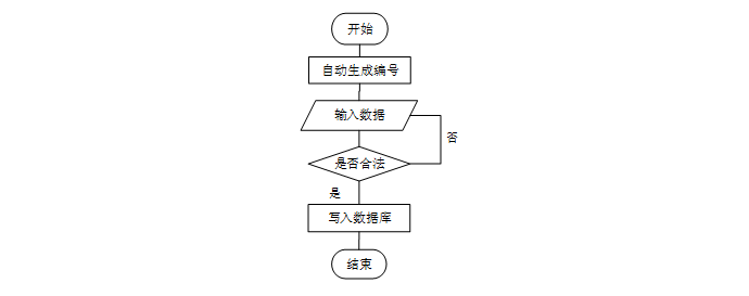 系统开始后自动生成编号,用户输入数据。系统判断输入的数据是否合法,若不合法则返回重新输入;若合法,则将数据写入数据库,最后结束流程。如图3-5-3所示。