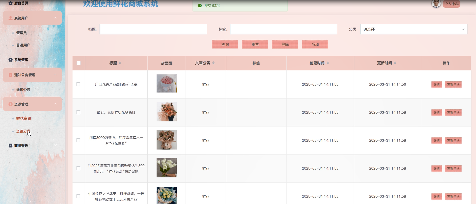 鲜花资讯管理:管理员可以查看鲜花资讯列表,并根据用户的浏览行为和评论等数据,添加新的鲜花资讯。此功能能够根据实时数据更新资讯内容,提升系统的动态性与准确性。