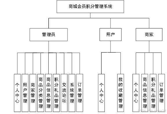 jsp模式来完成系统的相关功能。个人中心、用户管理、商家管理、商品分类管理、商品信息管理、积分礼品管理、交流论坛、系统管理 、订单管理等功能,联系管理员以及后台数据库管理功能。本系统经过测试,各项功能进行正常,能够满足用户的需求。根据以上对系统功能模块的划分和设计,可以得到系统功能模块图如图4-2所示,该图给出了详尽的模块划分和模块组织结构,能够直观展现系统的功能结构关系。管理员登录进入商城会员积