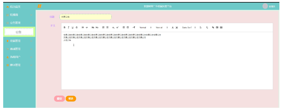 二手校园交易平台中的管理人员是可以对公告进行添加公告消息的,界面如下图4-9所示。