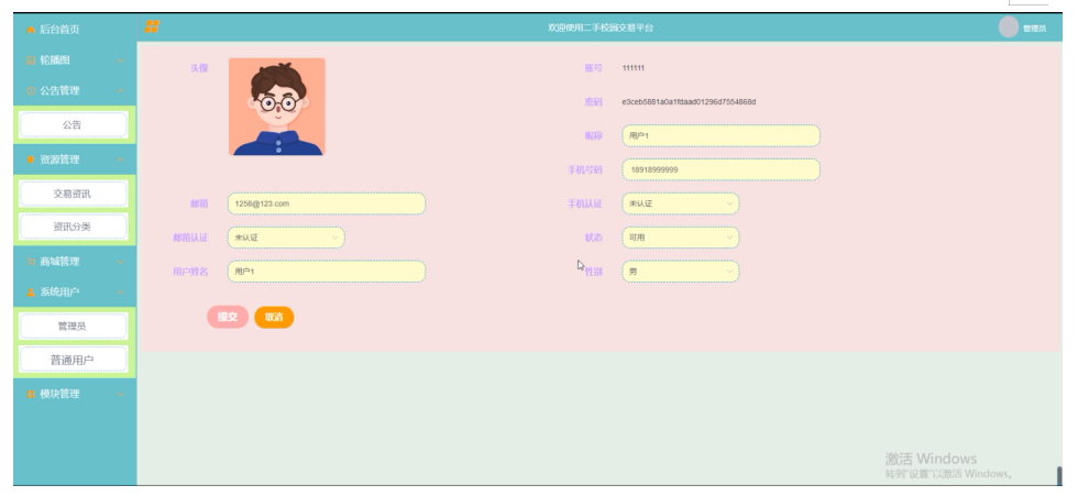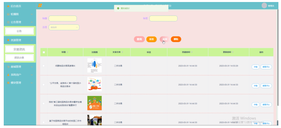 (2)资源管理:管理员在后台可以对二手校园交易平台中显示的交易资讯信息进行增删改查。