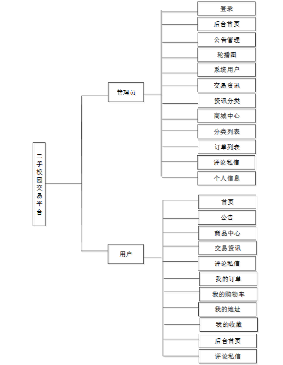 按照二手校园交易平台的角色,我划分为了用户管理模块和管理员管理模块这两大部分。
