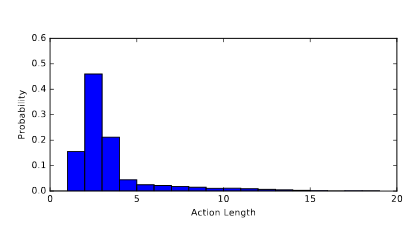 行动长度指每个行动重复的次数,无效的行动除外。游戏时,由于非瞬间反应时间,人类玩家趋向于重复按相同的键。另一方面,标准的MCTS可以更迅速地作出反应,因此它倾向于使很多长度为1的单帧动作。