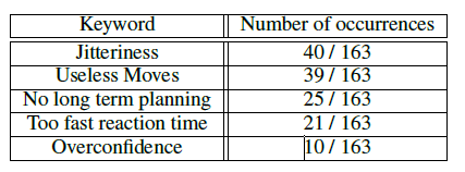 我们也分析了观察者基于视频的可选自由文本反应,为探究究竟哪些常见问题让人们相信,他所看到的游戏视频不是由人类所操作。在关键词或是表达语义相同时,答案会进行编码。表2显示的是能判断玩家是AI的高频关键词。