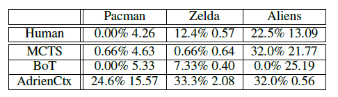 表1:人类,标准MCTS,AdrienCtx和BoT代理的胜出率和平均得分。