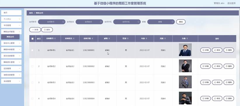 舞蹈老师管理:管理员通过舞蹈老师管理可以获取老师账号、老师姓名、老师手机、邮箱、性别、年龄、民族、 头像等信息,并进行详情、删除、修改等操作,如图5-4所示。
