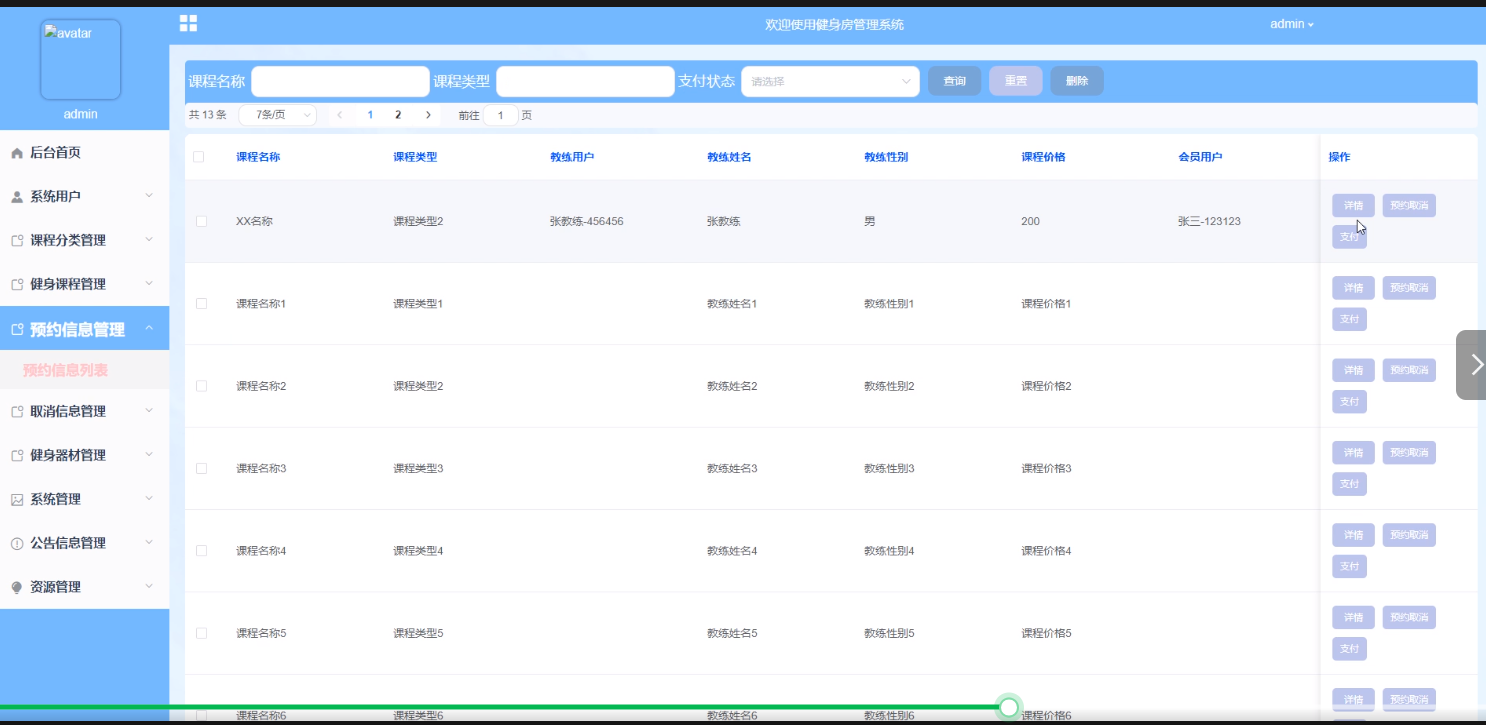 预约信息管理:管理员可以管理会员的预约信息,包括查看预约情况、确认预约、取消预约等操作,以确保课程的顺利进行和会员的满意度。界面如下图所示。