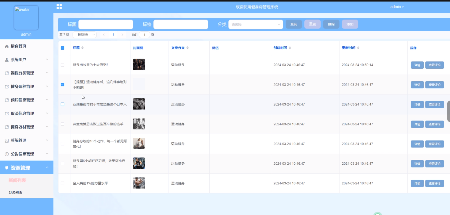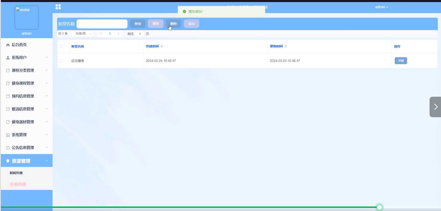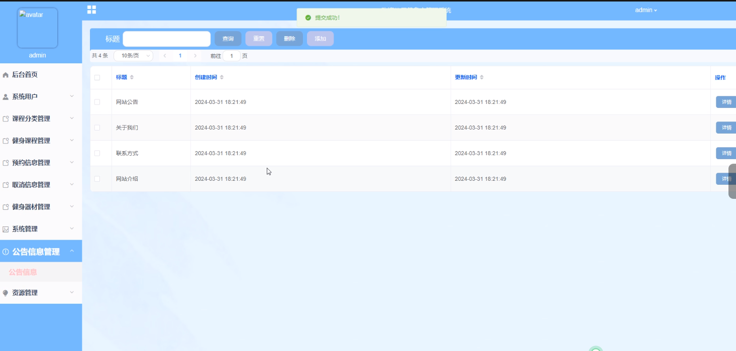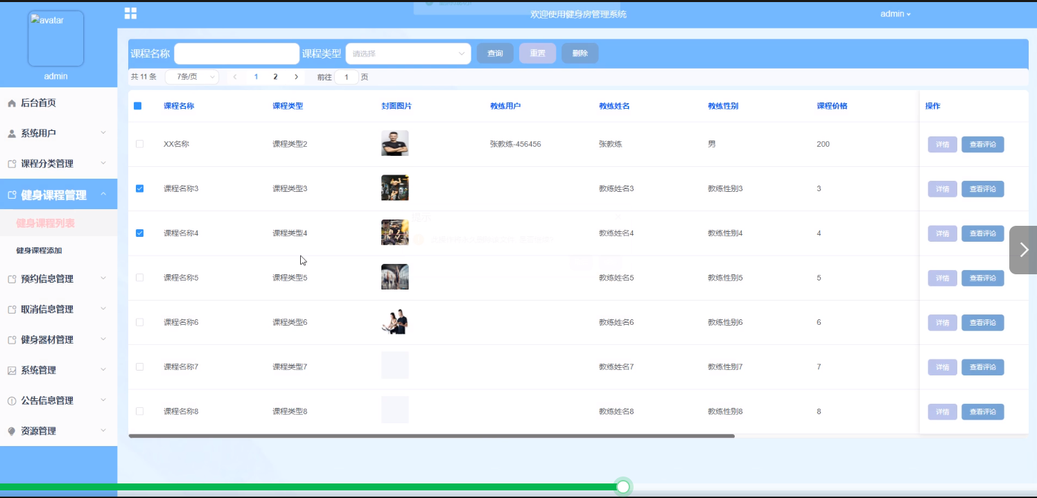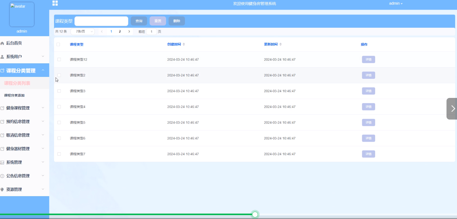 健身课程管理:管理员可以管理健身课程的信息,包括查询、添加、重置、删除课程等操作,以及设置课程的时间安排和教学内容,方便会员预约和参与。界面如下图所示。