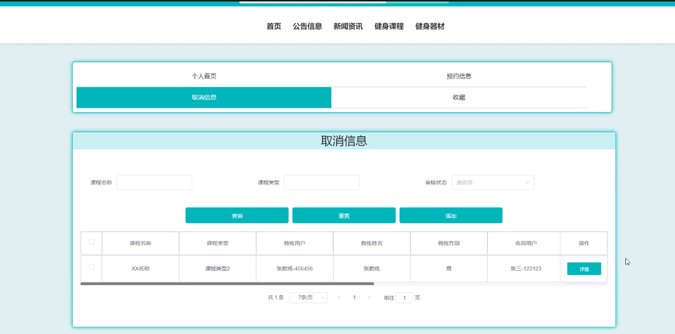 取消信息:用户可以查看已取消的健身信息,包括课程名称、课程类型等。还可以进行查询、重置和添加等操作。界面如下图所示。