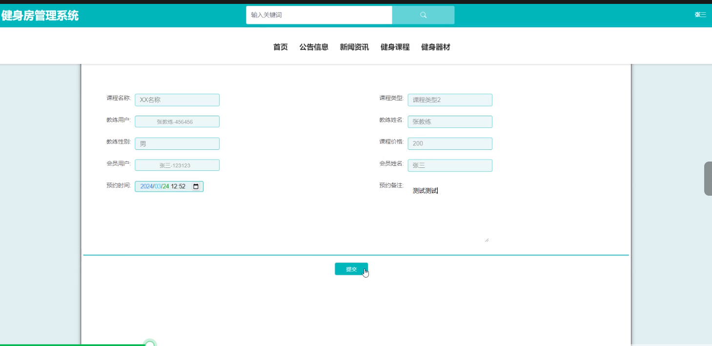 预约信息:展示会员已预约的课程或器材信息,方便会员查看自己的健身安排。