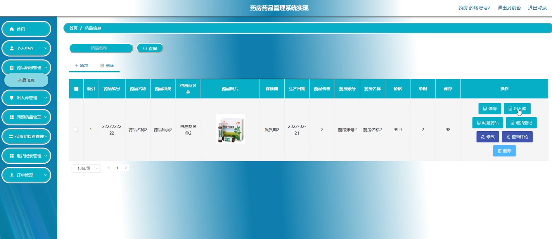 项目功能:用户,药房,药品信息,药品种类,供应商,药品出库,问题药品,保质期检查,退货记录,药品入库,账单信息。