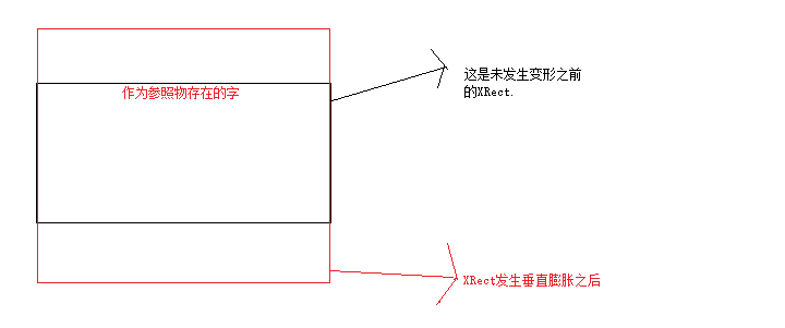 -100将会让XRect对象垂直膨胀,上图所示的黑色矩形变形成红色矩形,而作为参照物的字体显示在PDF中的位置是相对于红色矩形即变形之后的红色XRect而言的。这样可以让字体画在指定距离页面顶部的位置。相反,如果height的值是正数则会让矩形发生冷缩变形,从上图的参照物中,会让参照物不会显示在PDF中或者只是显示一半,这要看你指定的height的大小。