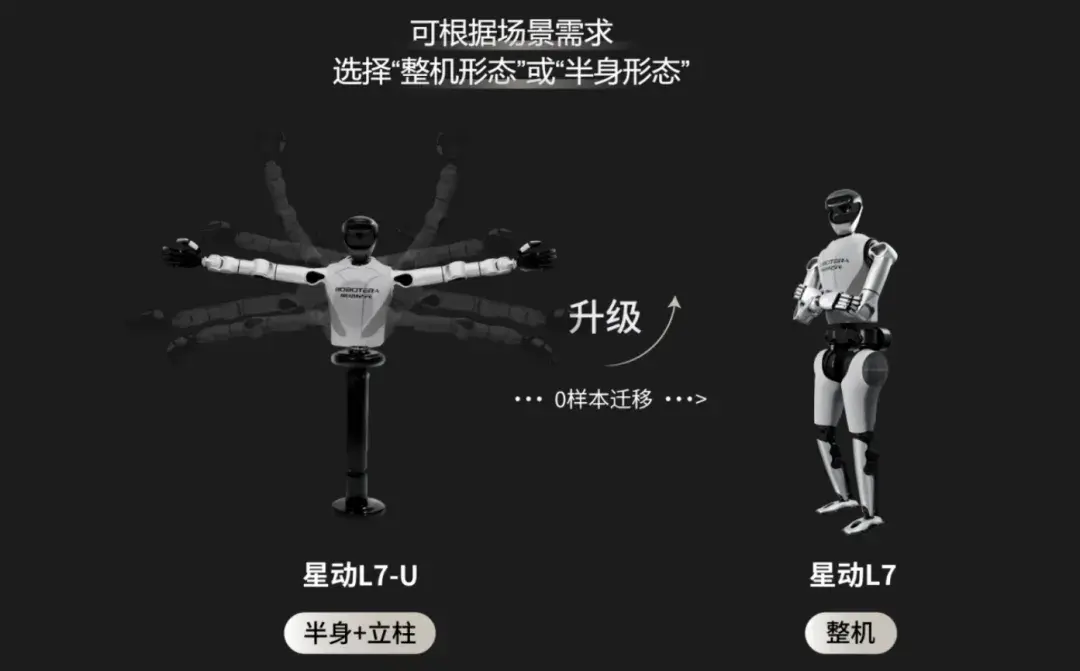 针对不同场景需求,星动纪元将L7 划分为两个版本:星动 L7-U(半身形态,由上半身与立柱组成)与星动 L7(整机形态)。两者的核心差异在于,L7-U 以立柱替代了 L7 的下肢双足结构,其余核心配置保持一致。