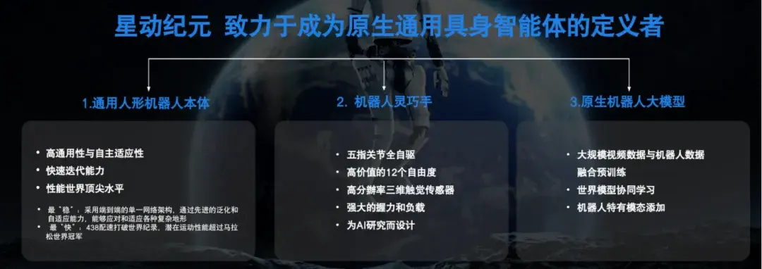 公司的定位是成为“原生通用具身智能体定义者”,以“开启机器人星纪元”为使命,致力于通过 “具身大脑”与“人形本体”软硬一体全栈自研,打造通用大脑及通用机器人。