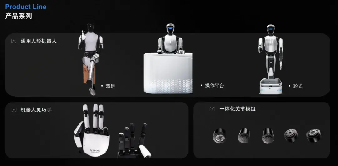 当前,星动纪元已建立了完整的产品矩阵,覆盖从核心部件到整机的全链条产品,包括一体化关节模组、机器人灵巧手以及通用人形机器人(足式/轮式以及只有上半身的操作平台)。