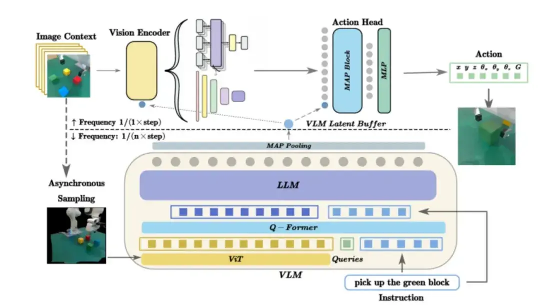 - 降维后的视觉语言标记(reduced vision-language tokens)通过条件化动作头(conditioned action head)解码为底层动作。