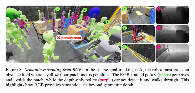 - 通过一个“到达目标点”的任务证明:基于RGB像素训练出的导航策略,具备语义推理能力。它能成功避开一些“不受欢迎的区域”,而这些区域对于只使用深度信息的策略来说是完全“不可见”的。