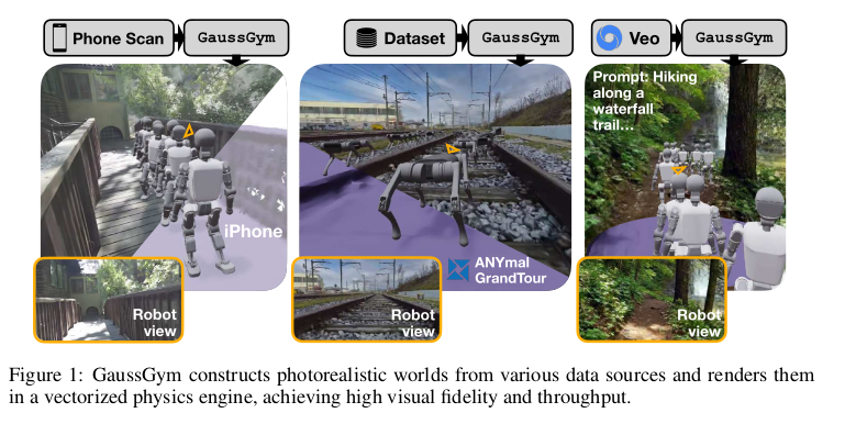 - GaussGym:一个快速开源的仿真模拟器,包含了 2500 个场景,从人工扫描、开放数据集和生成视频模型提供了多样化的场景重建。