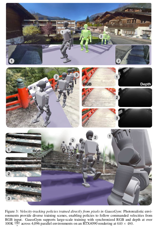 上述两条路径生成的资产(用于物理的网格 和用于渲染的高斯表示)会被自动地对齐于全局坐标系内。这确保了机器人“看到”的画面(由高斯渲染产生)和它“身体”感受到的物理碰撞(由网格计算得出)在空间上是完全一致、同步的。这是实现逼真仿真的基石。在仿真时,高斯泼溅会被作为“即插即用”的组件使用,提供逼真的视觉信息,并且可以进行大规模并行渲染。物理引擎则负责计算重力、摩擦力、运动和碰撞处理。并且,这两者保持完全同步。这种巧妙的设计使得 GaussGym 能够将多样的真实世界和合成数据整合起来,既利用了 3DGS 的速度优势,也能支持大规模大规模机器人学习。