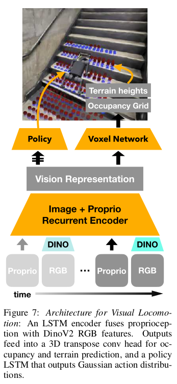 - 分享了一些关于解决视觉 sim-to-real gap 的发现,将几何重建作为辅助任务能显著提升爬楼梯的表现。