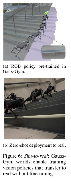 为了验证 GaussGym 在训练“视觉-运动”策略方面的有效性。具体就是为双足(人形)和四足(如狗型)机器人训练了移动和导航策略。尽管GaussGym速度更快、画面更逼真,但“直接从RGB像素学习”依然很难。因为策略网络必须从二维图像中自行推断出三维几何信息(比如地面的高度、障碍物的形状),而不能像传统方法那样直接使用现成的高度图或深度图。于是作者引入了一个辅助的重建损失函数。 在仿真训练时,系统拥有场景的精确三维模型(ground truth meshes)。他们要求策略网络在学习控制机器人的同时,额外学习重建出它所“看到”的场景的几何结构。这个“附加任务”像一个老师,引导网络更关注场景的几何特征,从而显著提高了学习的速度和最终的性能。作者将在GaussGym 中仅通过视觉训练出的策略,不经过任何在真实机器人上的额外调整,直接部署到真实的机器人上进行楼梯攀爬测试,并取得了初步成功。这是向填补视觉仿真与现实差距所迈出的第一步。GaussGym 降低了对高逼真度仿真技术的使用门槛,为未来关于视觉移动和导航的研究提供了坚实的基础。