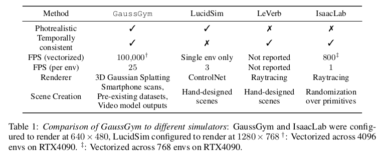 - 性能更强: LucidSim不提供向量化渲染(即无法同时并行渲染成千上万个环境);而GaussGym的设计原生支持向量化渲染,从而实现了前所未有的模拟速度。
