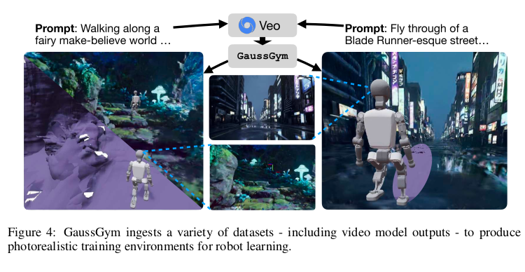 前沿生成式视频模型能根据文本提示生成逼真、多视角一致的视频,为大规模3D资产和环境创建提供了革命性的可能性。但是生成(推理)速度极慢,无法直接作为仿真器使用。GaussGym的设计正好可以接纳这些模型生成的视频作为输入,将其转化为可交互的仿真环境,从而 bridging the gap(架起桥梁)。