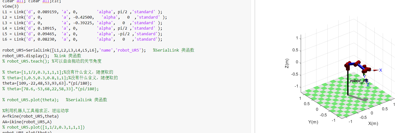 上述代码使用机器人工具箱的Link函数定义了UR5机器人的各个连杆参数,然后通过SerialLink函数建立了UR5机器人模型ur5。通过对比可以发现,机器人工具箱建立模型的方式更侧重于参数化定义,而Simscape建模则更接近实际物理结构的搭建,两者各有优劣,在不同的研究场景下可以灵活选择使用。