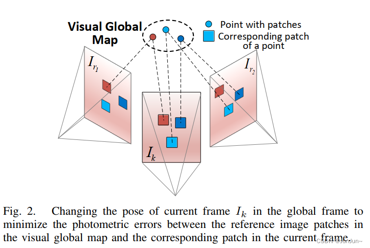 不同于文献 [15] 的frame-to-frame的图像对齐方式,我们通过最小光度误差以一种coarse-to-fine的方式执行sparse-direct frame-to-map图像对齐,如图2所示: