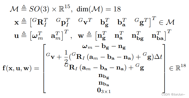 其中代表了加速度的采样周期,状态x,输入u和噪声w,函数f定义如下:
