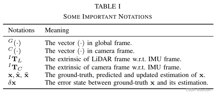 在我们的系统中,我们假设三个传感器(激光雷达,IMU和相机)之间的时间偏差是已知的(提前通过标定或者硬同步)。我们把IMU坐标系当作body坐标系(符号表示为I),同时第一帧的body坐标系作为全局坐标系(符号表示为G)。此外,我们假设三个传感器之间是刚性连接,且彼此之间的外参(在表I中定义)也是标定好的。然后在IMU第i次的测试时离散状态转移模型: