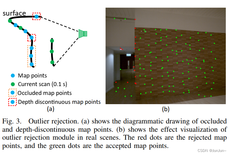 The visual submap可能包含当前图像帧中被遮挡或深度不连续的map points,这会严重降低VIO精度。为了解决这个问题,we project all the points in the visual submap onto the current frame using the predicted pose in ,在每个40×40像素网格中只保留的最小深度点。此外,我们将最近的激光雷达扫描中的点投影到当前帧,and check if they occlude any map points projected within 9 × 9 neighbor by examining their depth。被遮挡的贴图点被拒绝(见图3),剩余的将用于对齐当前图像。