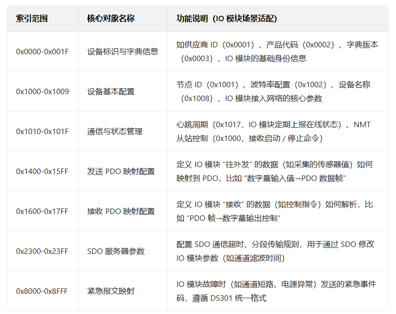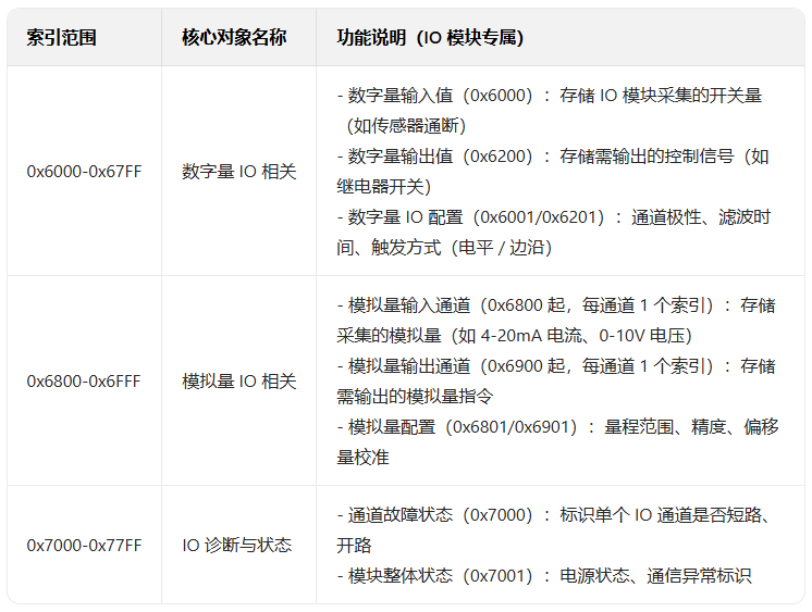 DS401属于子协议,专门定义数字量 / 模拟量 IO 的采集、控制、诊断等特有功能,索引范围集中在 0x6000-0x77FF,核心条目按 “数字量 IO”“模拟量 IO”“诊断” 分类