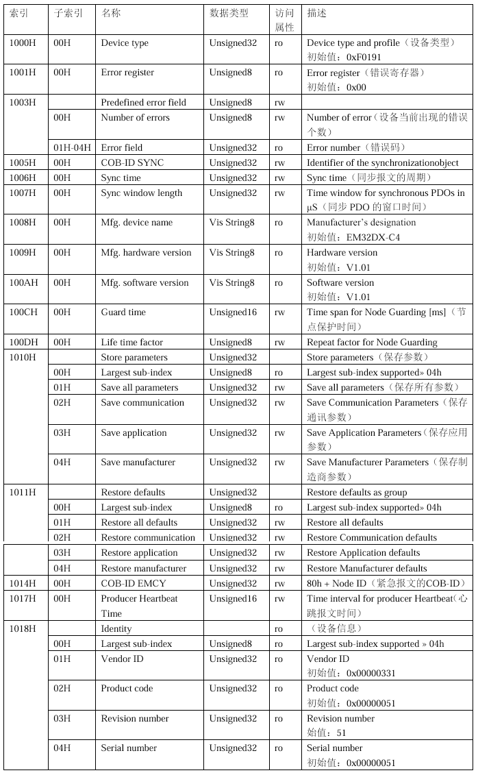 针对我们对接的EM32DX-C4查看设备手册,DS301对应的数据字典的通用参数如下: