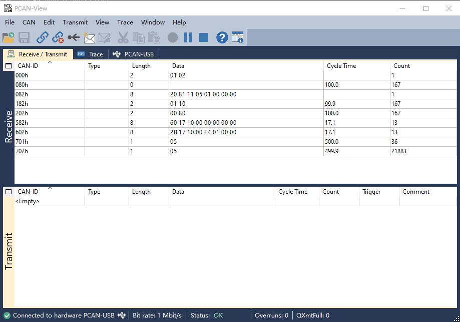由于我对 CANOpen 协议的了解不够深入,且是初次接触塞雷 EM32DX-C4 硬件模块,初期的调试工作遇到了不少阻碍。好在手头恰好有 PCAN-USB 模块,将其接入 CAN 总线后,我通过 PCAN-View 工具实时监听 CAN 帧数据,这一操作直接显著提升了开发与调试的效率(如下图)。