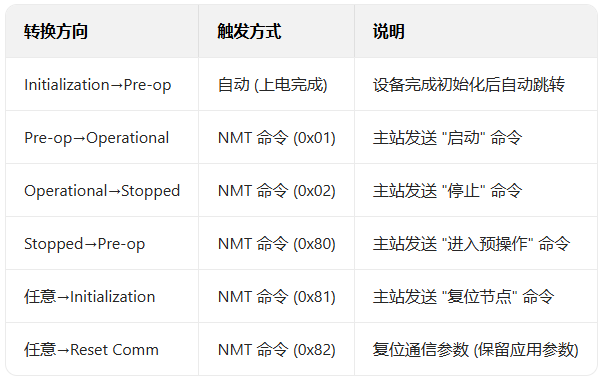 NMT服务用于通过NMT命令(如:启动、停止、复位)来控制CANopen设备的状态(如:预运行、运行、停止)。