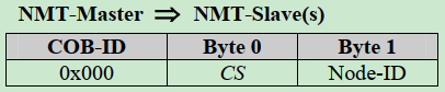 为了改变状态,NMT主机发送一个带有 CAN ID 的2字节消息(即功能代码和节点ID )。所有从站节点都处理这个报文。节点ID 0表示广播命令。