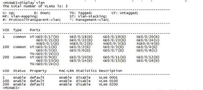 (3)查看当前交换机的VLAN,记录命令视图、查看命令;