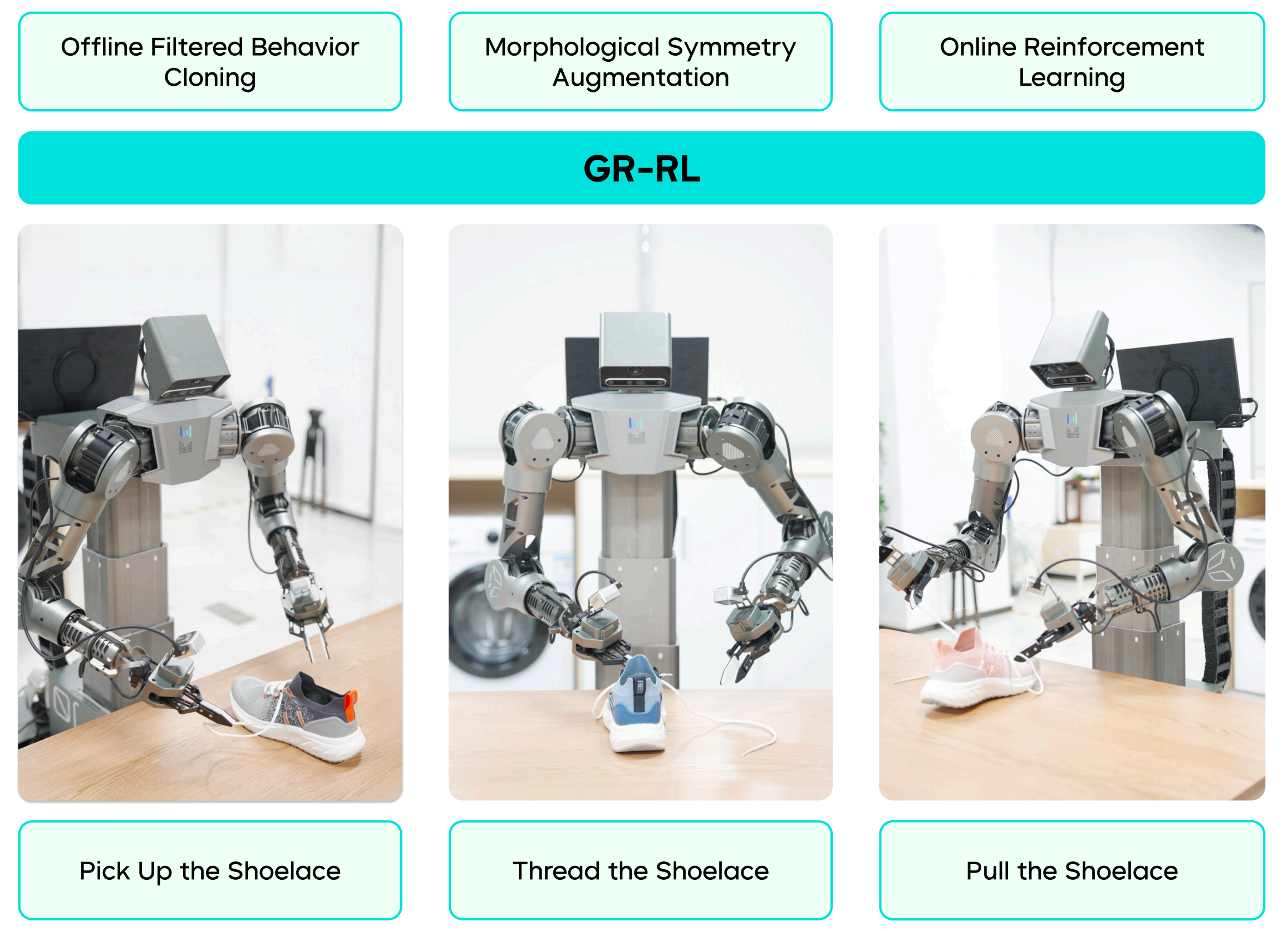 GR-RL采用了多阶段强化学习增强的训练流程用于筛选、增强并强化:次优及不匹配的人类演示数据