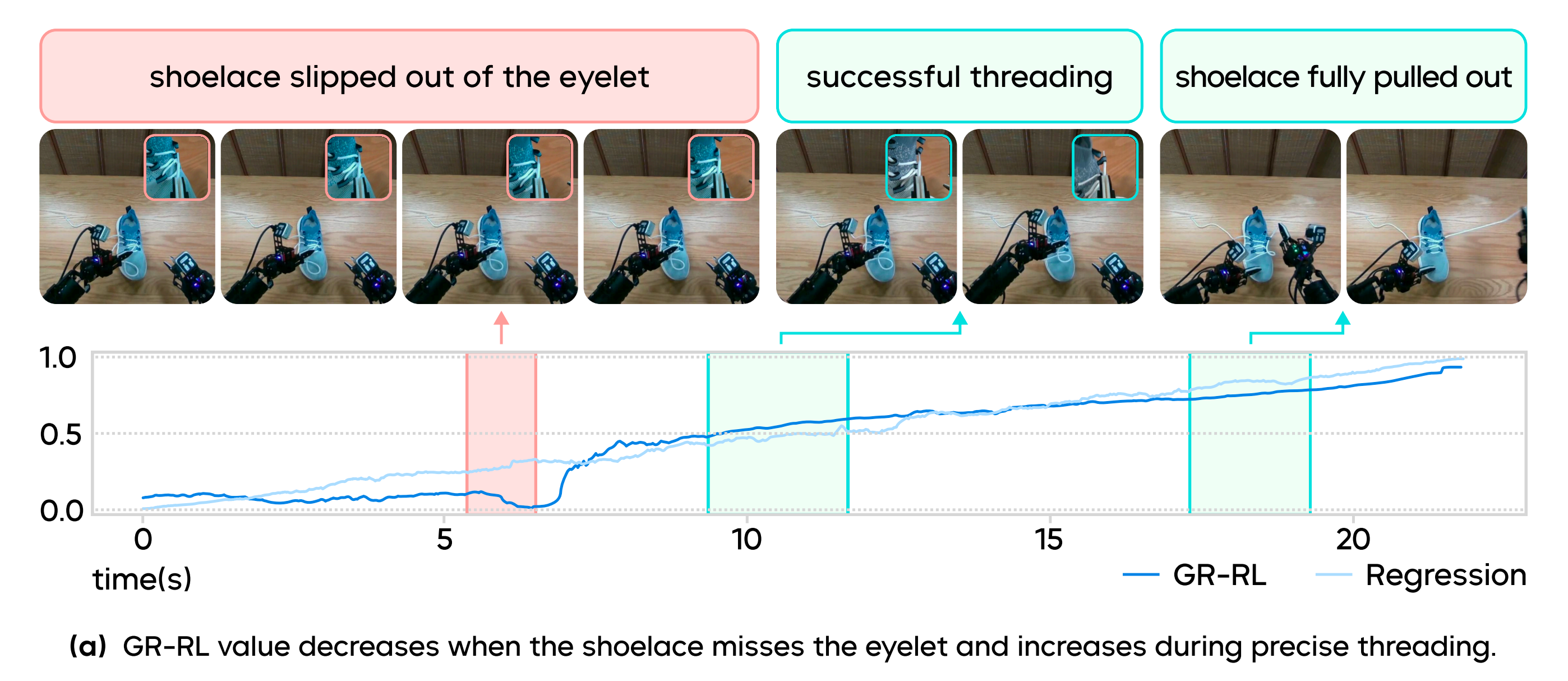 GR-RL——首个让机器人系鞋带的VLA:先离线RL训练一个“分布式价值评估器”以做任务进度预测,后数据增强,最后在线RL