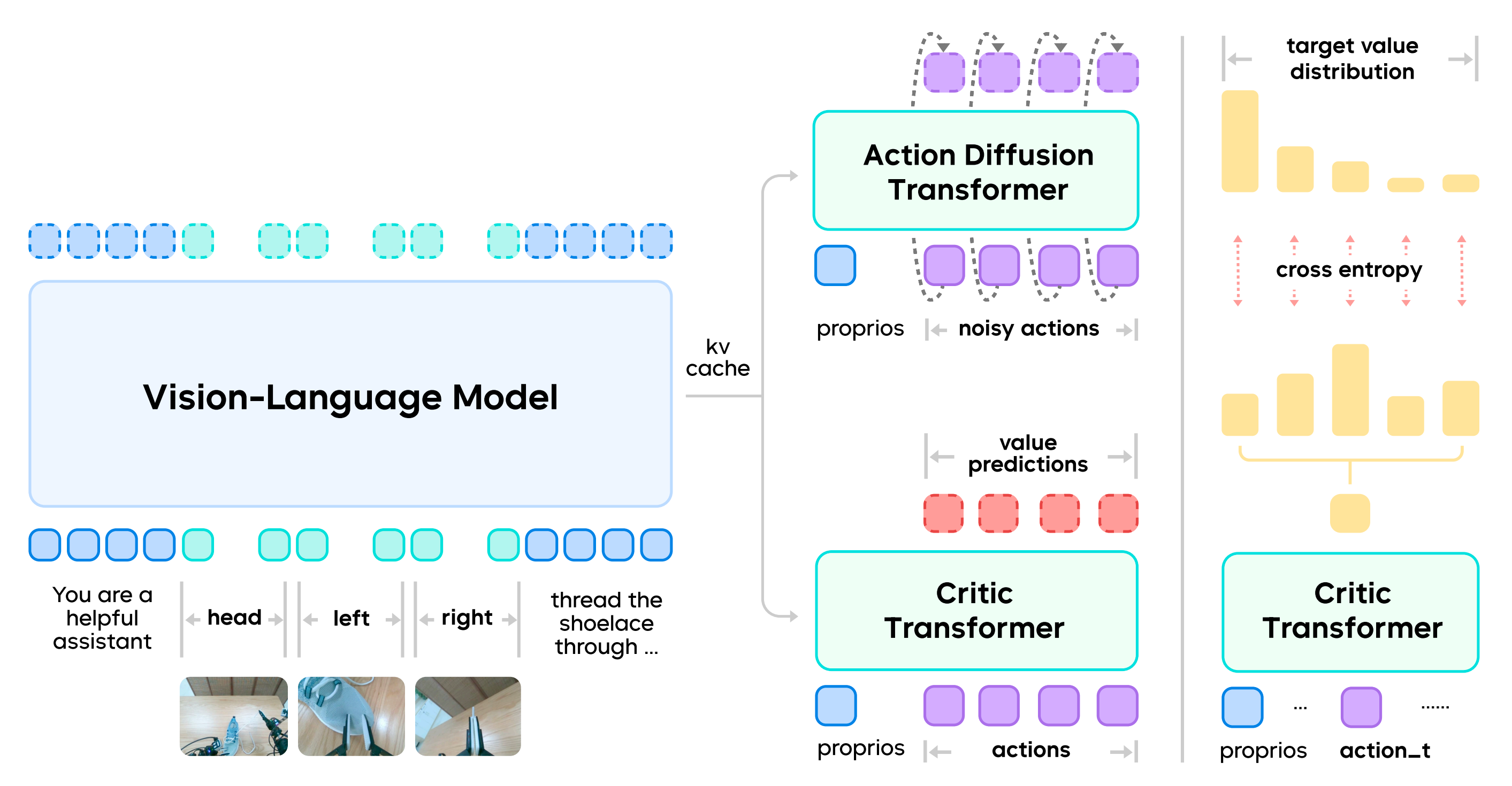 组成,总参数量为50亿『如下图所示,GR-RL采用了一种Mixture-of-Transformer, 即MoT架构。它通过流匹配目标(flow-matching objective)共同训练机器人视觉-语言-动作轨迹,以及通过分布式强化学习(distributional reinforcementlearning)进行时序差分(Temporal-Difference, TD)误差的训练』