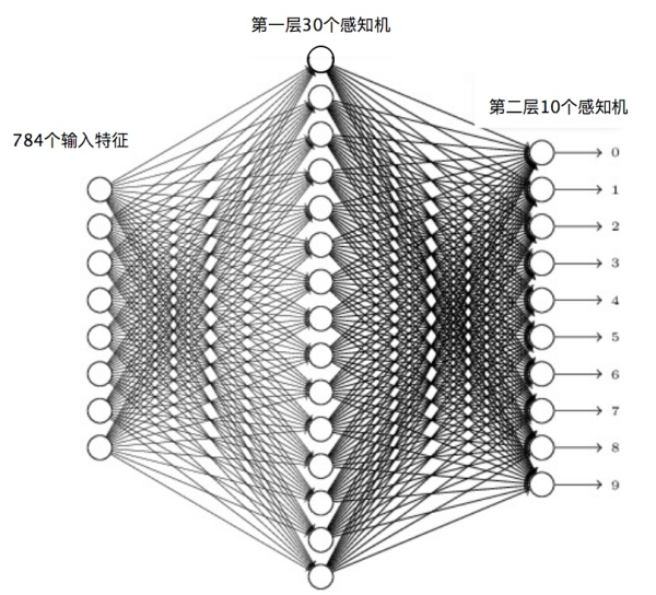 这个手写数字样本中的每个数字都是一个28×28像素的图片,我们把每个像素当作一个特征值,这样每个数字就对应784个输入特征。因为输出需要判别10个数字,所以第二层(输出层)的感知机个数就是10个,每个感知机通过0或者1输出是否为对应的数字。