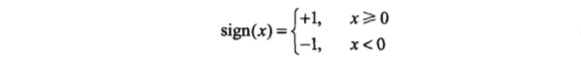 其中xxx代表输入的特征空间向量,输出空间是{-1, +1},www为权值向量,bbb叫作偏置,signsignsign是一个符号函数。