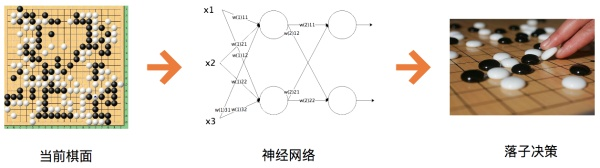 对于一个19×19的围棋棋盘,在下棋过程中,每个位置有黑、白、空三种状态,将其提取为特征就是神经网络的输入(事实上,输入特征还需要包括气、眼、吃等围棋规则盘面信息)。而输出设置19×19即361个感知机产生对应的落子。然后将大量人类的棋谱,即当前盘面下的最佳落子策略作为训练样本,就可以训练出一个智能下棋的神经网络。