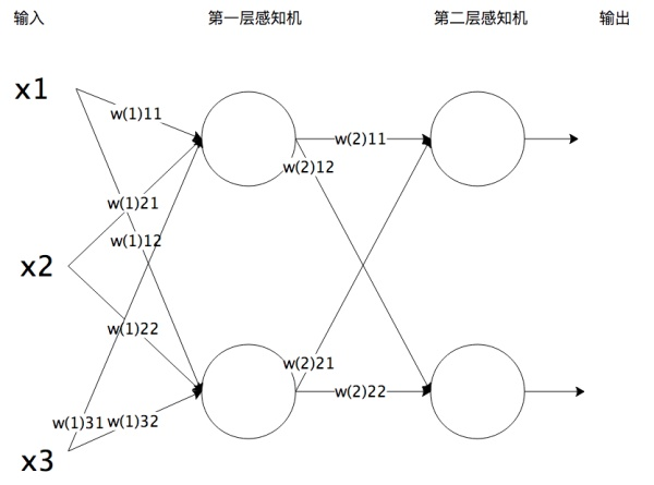 将感知机组成一层或者多层网络状结构,就构成了机器学习神经网络。下图就是一个两层神经网络。