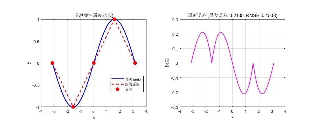 可以看到,sin(x)函数可以由这5条直线近似化而成,可以看一下它与原曲线的误差变化。