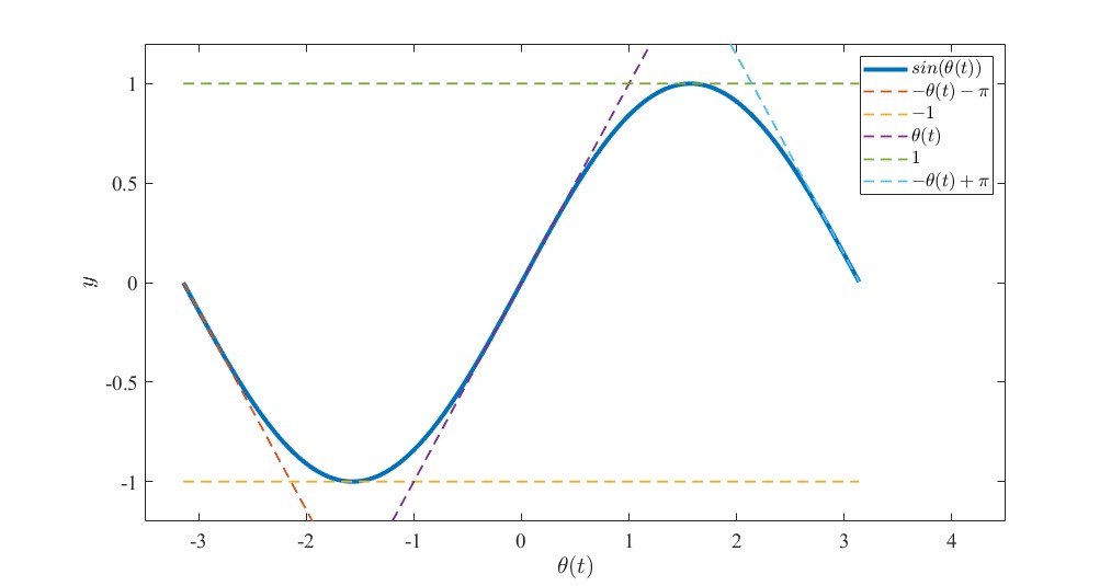 除了工作点处,其余sin函数处的曲线可以看成是该5条直线的“加成”,如下图所示。