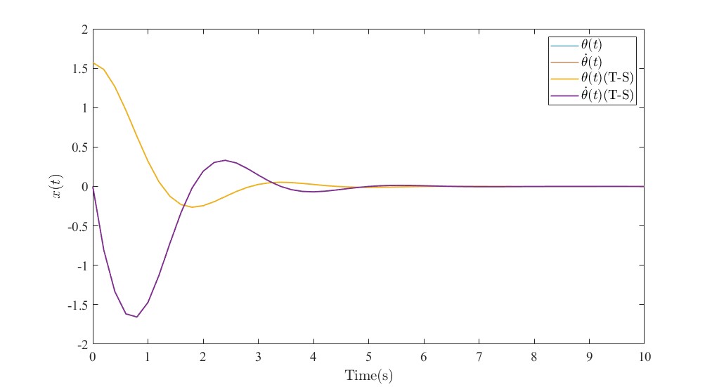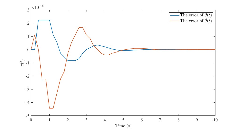 我们可以看到,当T-S模糊后的系统从仿射系统变成线性系统后,其误差相较于原始非线性系统而言非常小,几乎是0。由此可见T-S模糊方法在机器人系统这一典型非线性系统中线性化的优势。